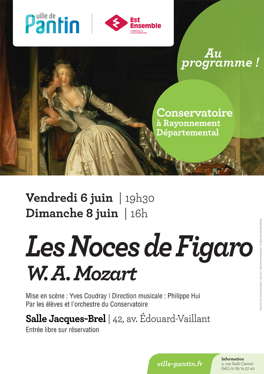 Tous les deux ans, la classe d’art de la Scène du Conservatoire de Pantin (CRD), dirigée par Yves Coudray travaille sur la création d’un grand spectacle lyrique. Cette année, le metteur en scène a choisi » Les Noces de Figaro » et invite le Chef d’Orchestre Philippe Hui pour diriger l’Orchestre du Conservatoire: