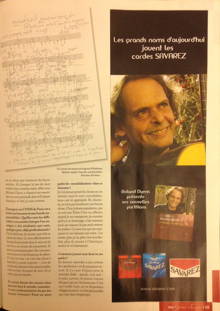 A l’occasion de la sortie de ses « 100 », cent pièces pour guitare, des » piècétudes », Roland Dyens, actuellement en concert en Italie, fait la une du magazine Guitare Classique avec pas moins de 6 pages intérieures !