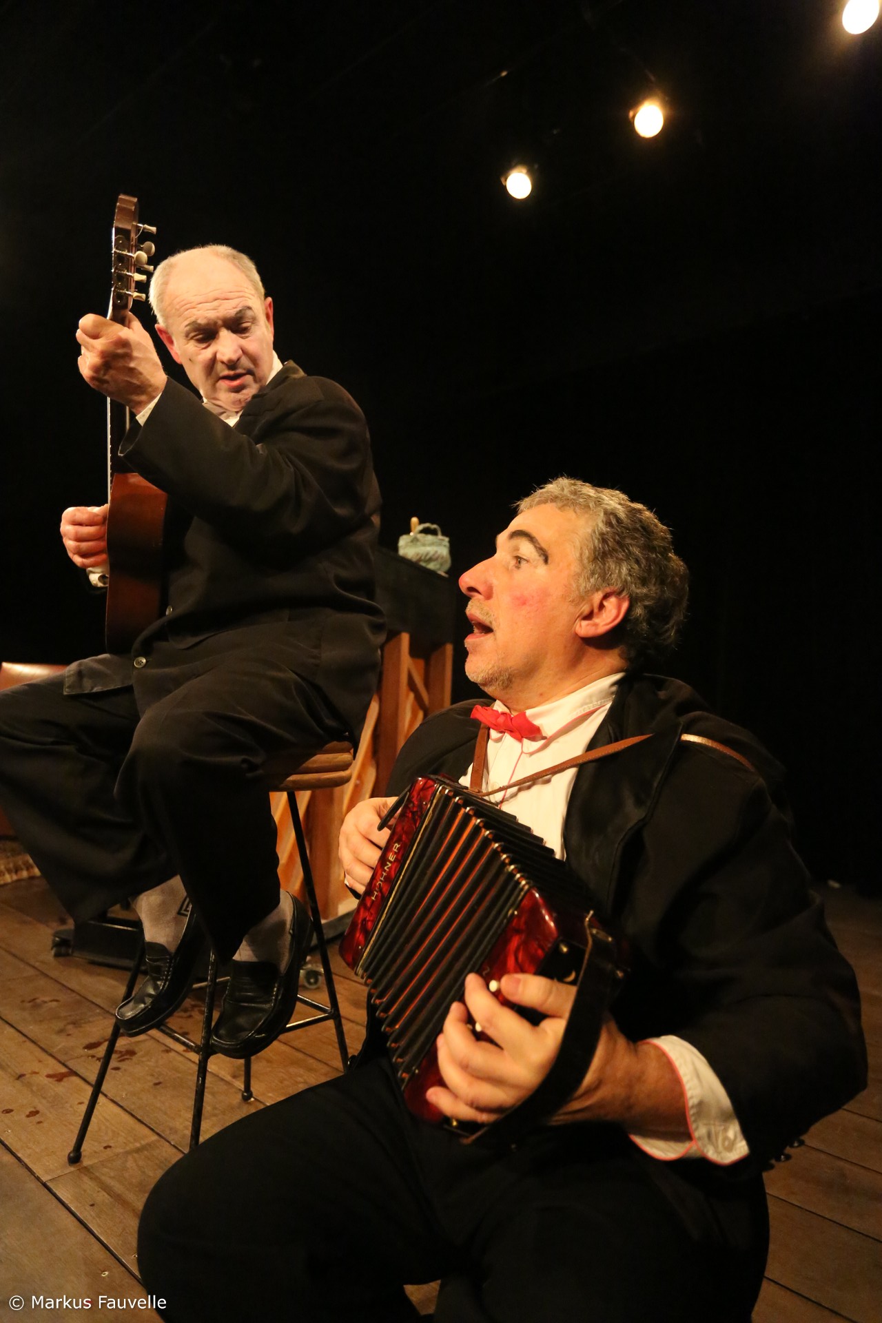 Sur la scène, le musicien (Patrick Dray) et le chanteur (Luciano Travaglino), le duo classique du comique et du faire-valoir, du clown blanc et de l’Auguste.