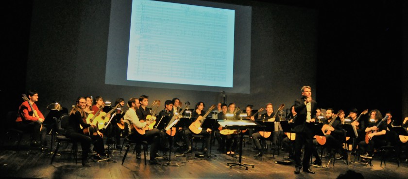 TAMBOUROU, composition de Roland Dyens pour orchestre de guitares et 3 rangs de percussions. Direction: Jean-Marc Zvellenreuther.