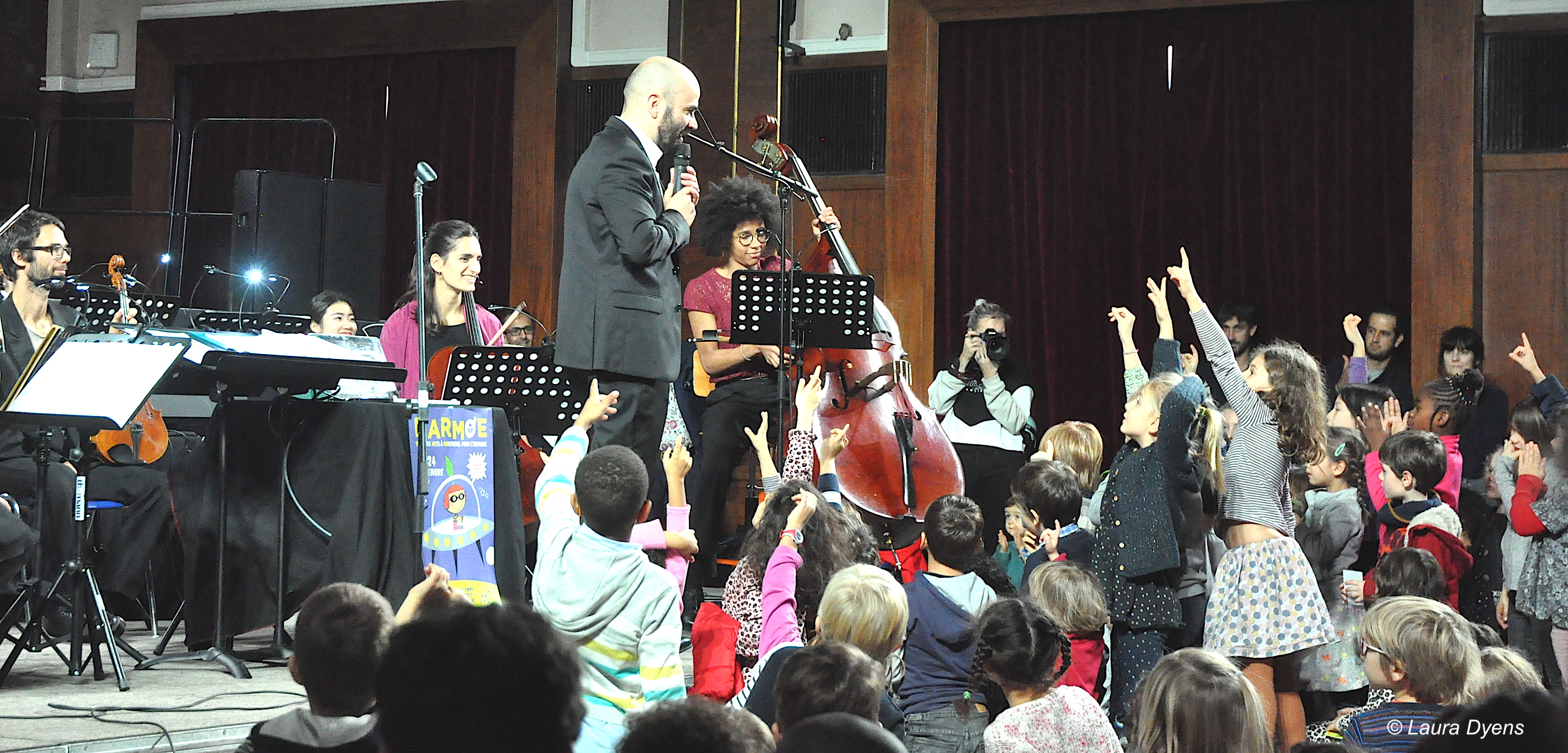 Notre projet est de donner ce concert pour un public familial ou dans le cadre d’un concert scolaire avec projet pédagogique. Dans tous les cas, les enfants sont acteurs du concert, en chantant, ou faisant des percussions corporelles et en répondant aux questions sur les instruments du Chef d’orchestre.