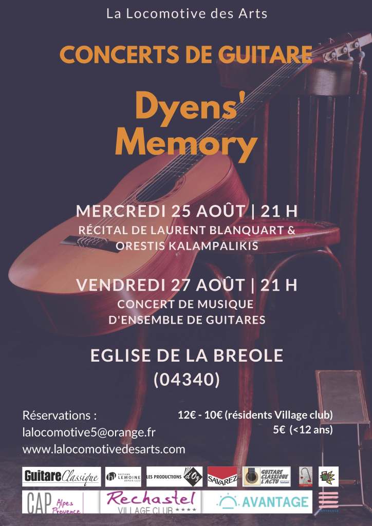 Le mercredi 25 août, Laurent Blanquart et Orestis Kalampalikis, guitaristes et professeurs du stage Dyens’Memory donneront un concert de guitare classique à l’église de La Bréole (04340).