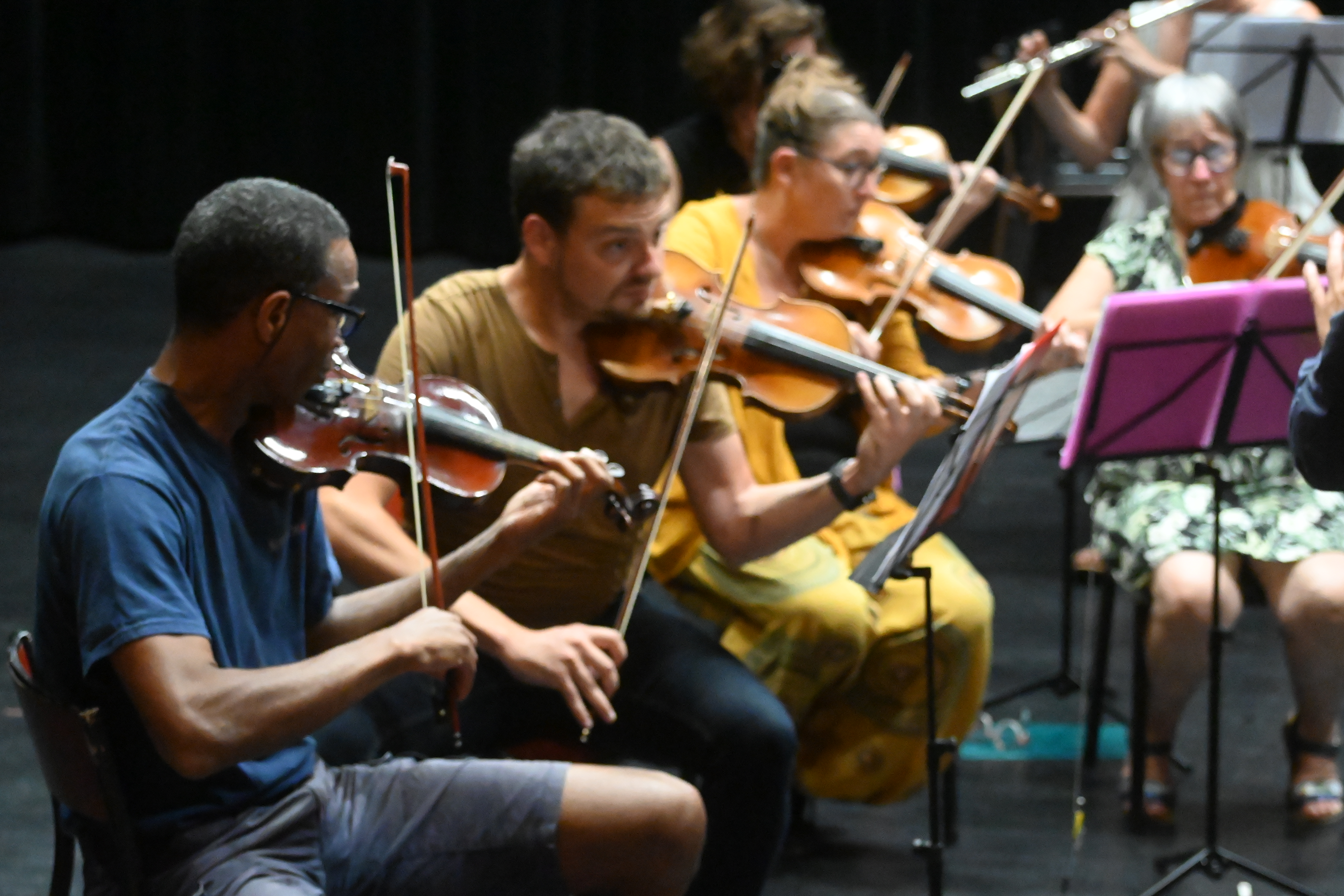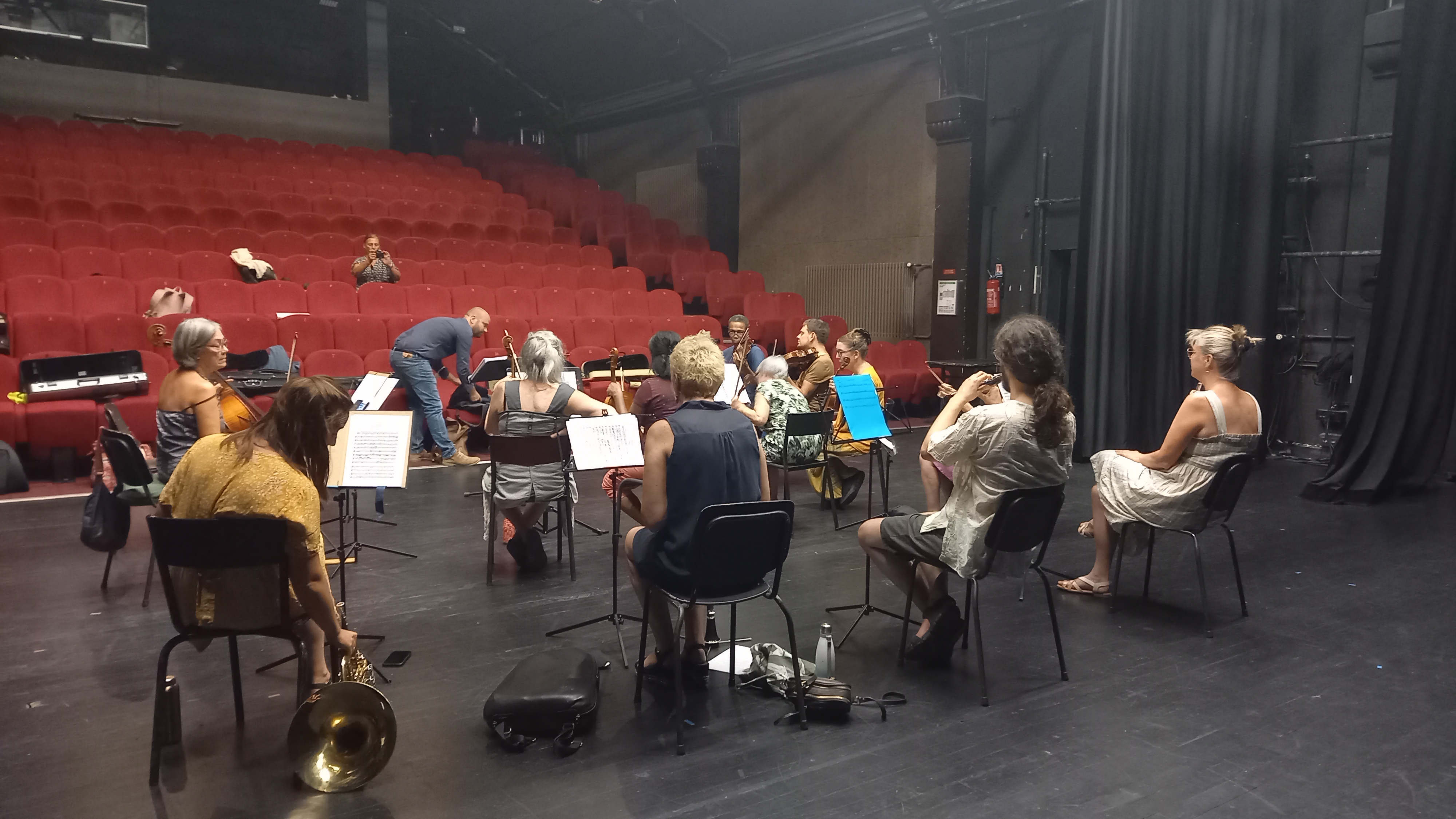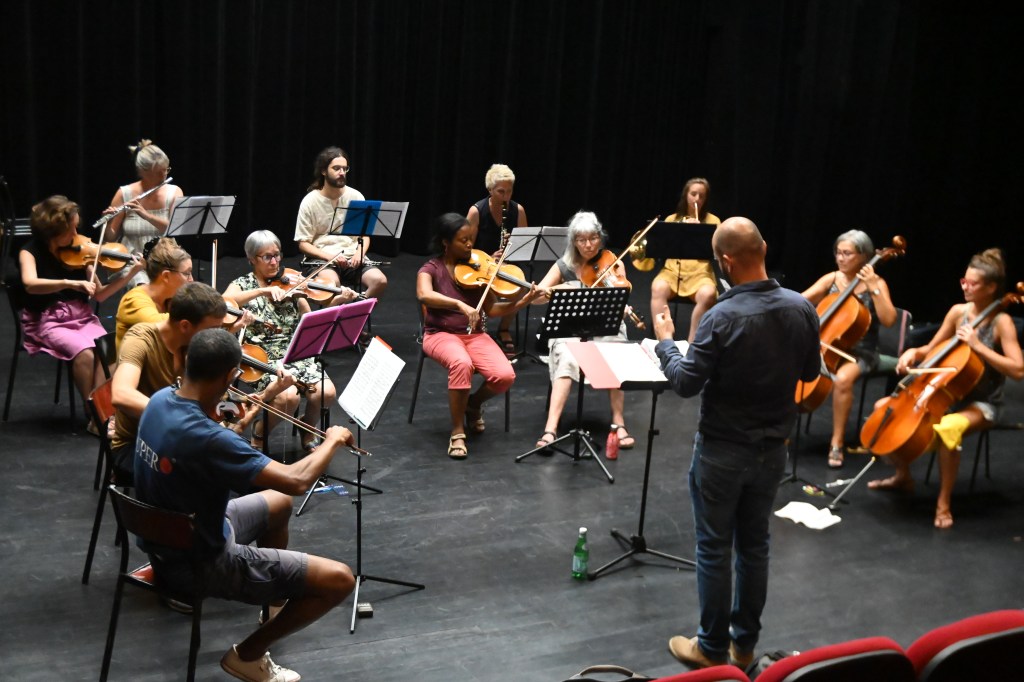 Mardi 23/08/2022 et jeudi 25/08/22 soir, l’orchestre éphémère, composé de musiciens de la Ville, a répété avec Mathieu Braud au Théâtre Berthelot à Montreuil (93)