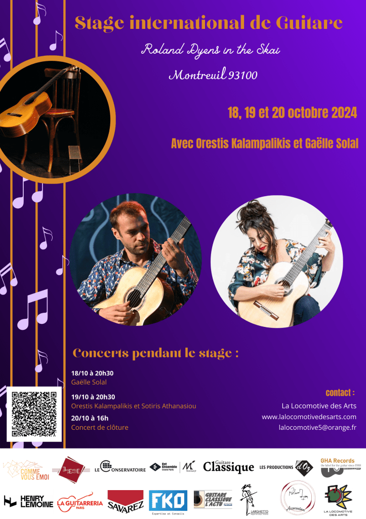 Under the banner of the music of guitarist and composer Roland Dyens, this three-day professional workshop, part of the Roland Dyens in the skaï Guitar Festival, will take place on October 18, 19 and 20, 2024 at Comme Vous Émoi cultural center in Montreuil. It is organized by the Association La Locomotive des Arts, in partnership with the Roland Dyens in the skaï Association, and will be led by guitarists Gaëlle Solal (Belgium) and Orestis Kalampalikis (Greece).