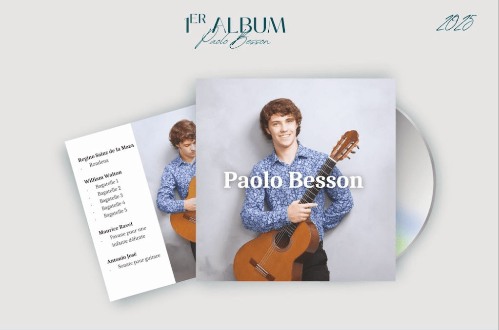 En 2025, Paolo Besson a publié son premier album, dans lequel il explore les dimensions orchestrales et colorées de la guitare classique. La richesse de sa palette sonore, alliée à une virtuosité maîtrisée et expressive, confère à ses interprétations une identité singulière et profondément personnelle.