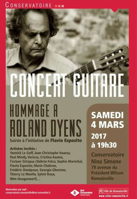 Le samedi 4 mars 2017 à 19h30, Flavio Esposito, Professeur de guitare au Conservatoire de Romainville, et ancien élève du Maestro, a organisé un concert en hommage à son Maître et Ami avec les musiciens des deux premiers groupes de Roland Dyens.