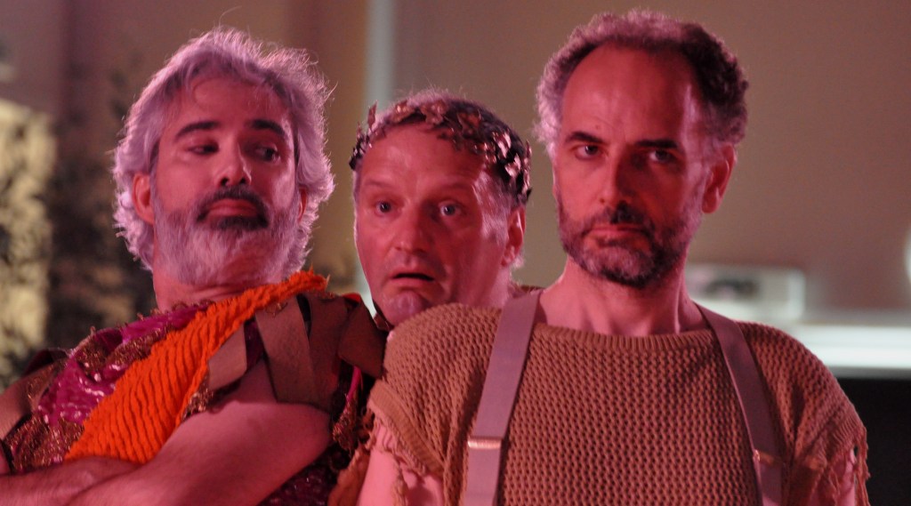 Extraordinaire trio avec Agamemnon, roi des rois (Franck Leguérinel), Ménélas roi de Sparte (Pierre Méchanick), et Calchas, Grand augure de Jupiter (Gilles Bugeaud)